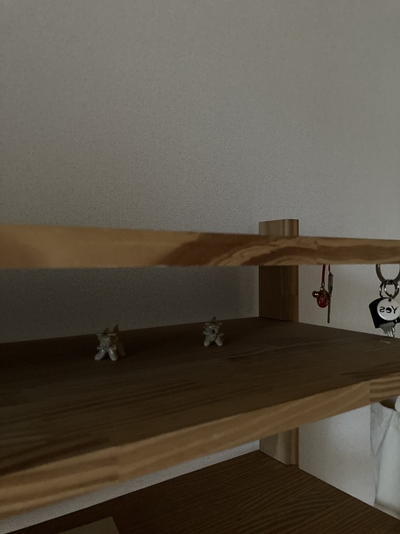 我が家の玄関入ったすぐの棚です。引っ越してきてすぐに自分で作った DIY で超ぐらぐらだけど気にしない。
