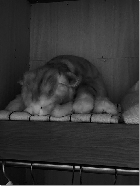 最近のわたしのベッドサイドテーブルには(左から)老眼鏡、起きている猫、時計が常駐しています。