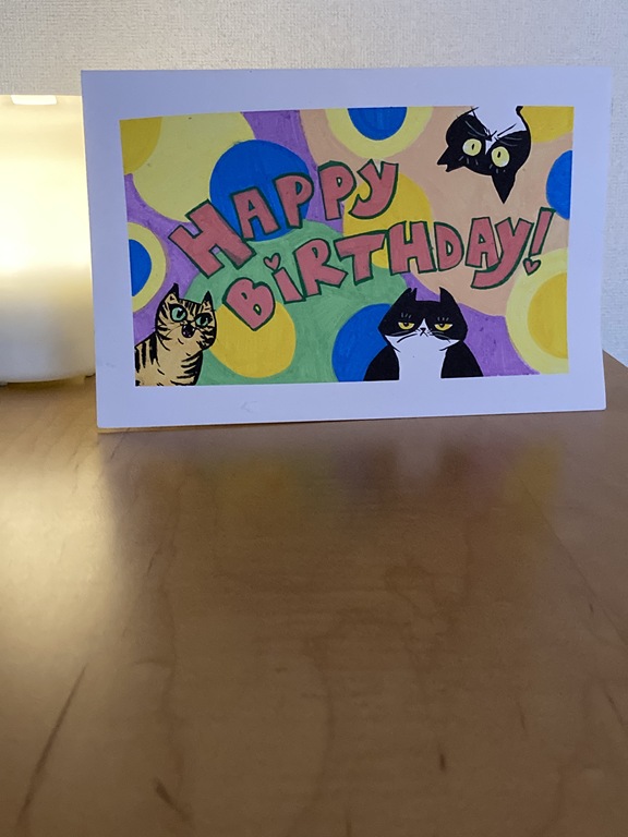 友人が贈ってくれた手描きのお誕生日のカードにペットの三匹の猫が。名前は(左から右、下から上に)SPさん、TBSさん、Mさんです。