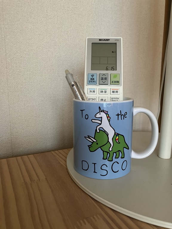 もともとゲスト用に購入した(わたしにはちょっと)大きめマグカップ。気に入って使ってもらっていましたが、パンデミックでゲストを迎えることがなくなり、リモコンとペン立てとして使っています。リモコンのボタンと色が合うし。ペンは一本派です。