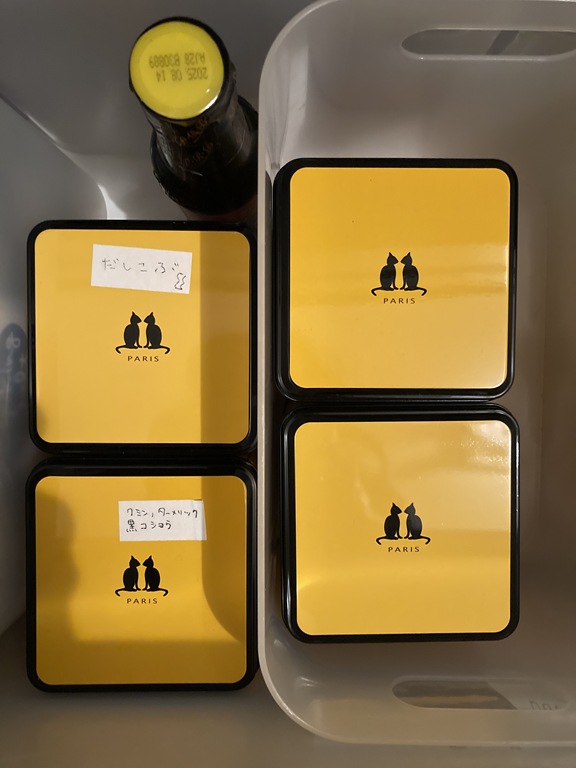 この10年ほど?で消費したダージリンの葉っぱが残してくれた空き缶に、出し昆布やらスパイスやらをいれてます。