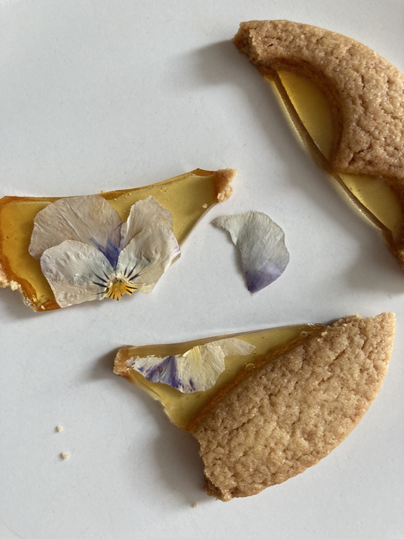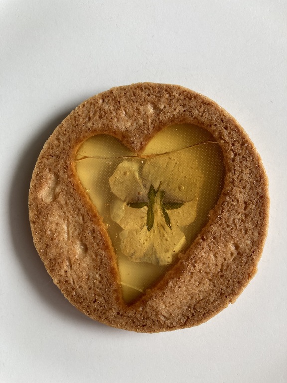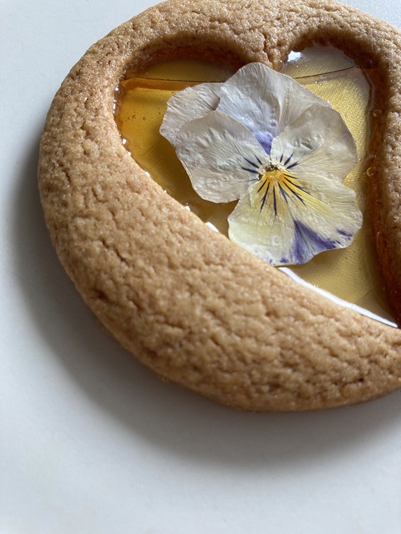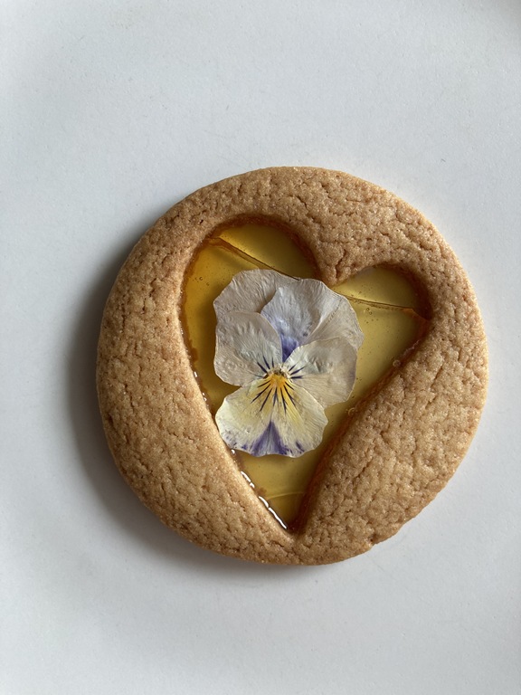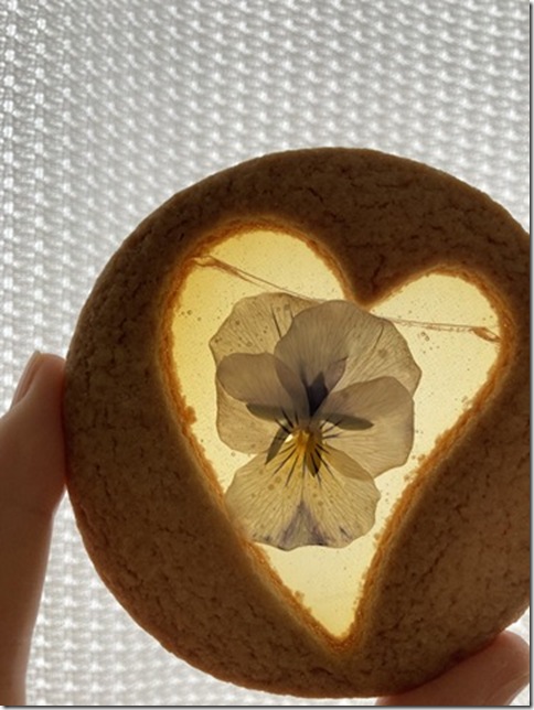 写真ではクッキーちょっと分厚く見えますが、薄いのです。ステンドグラスの部分は、さらに薄いのです。ビオラちゃんは押し花です。