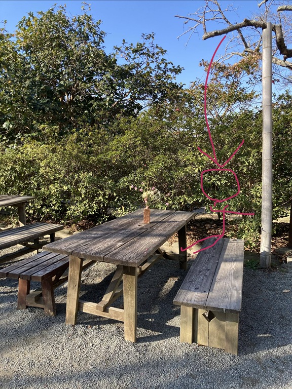 源氏山(山の上にテーブルと椅子。桜と椿)