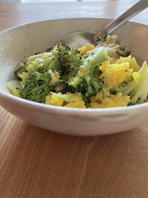 ブロッコリとジャガイモのハッシュの黄色いもち米和え 麦米あわせ味噌を添えた
