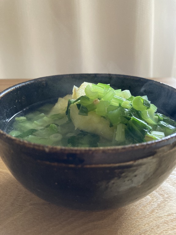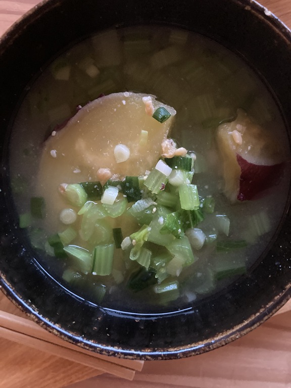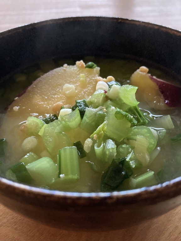 また小松菜の茎、小松菜の葉、さつまいも、青ねぎ、湯気、かつおだし、麦米あわせ味噌