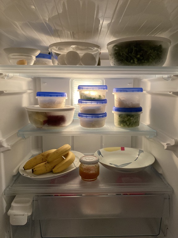 大量に作り置きしたときは冷蔵庫にも、小分けして冷凍庫にも入れておきます。電子レンジで温めればすぐ食べられます。