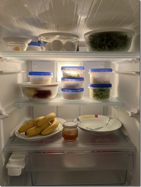上段左から右へ:ホットクック製 半熟ゆで卵の黄身2/3(小皿でフタをしてある)、玉ねぎちょびっと(再利用ビニールでくるんでジプロク容器に入れてある)、背後にピクルス二種類、ホットクック製 半熟ゆで卵、緑の葉っぱ(洗って水を切ってある)