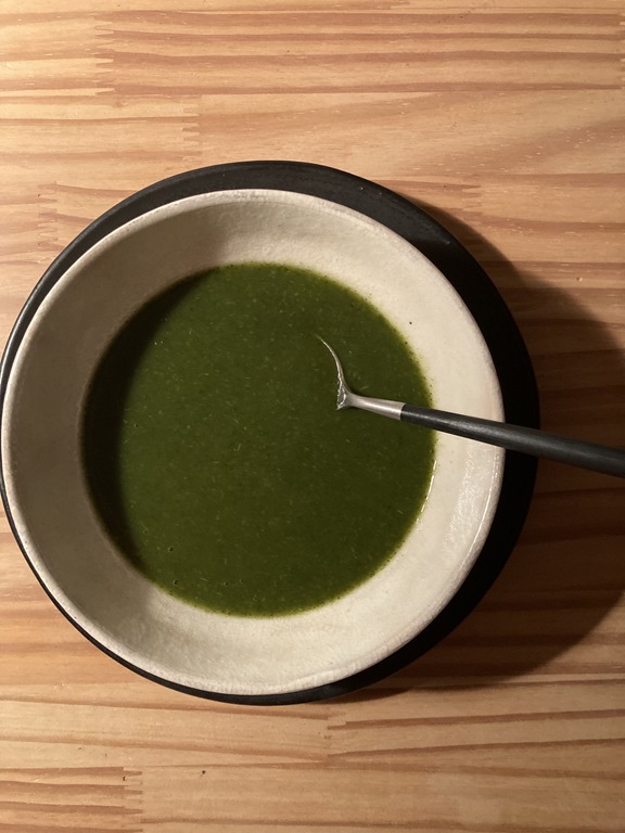 緑の葉っぱのスープに生のバジルの葉っぱを入れて、緑のソースとして使ってみたら、よい感じでした。
