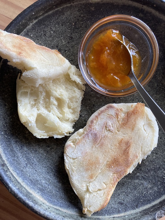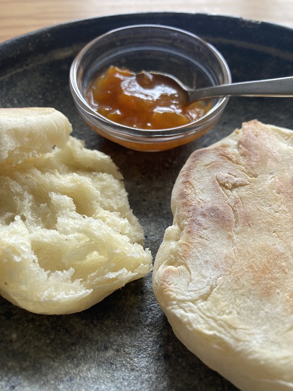 ホームベーカリーの生地をフライパンで焼いたパン、あんずのジャム