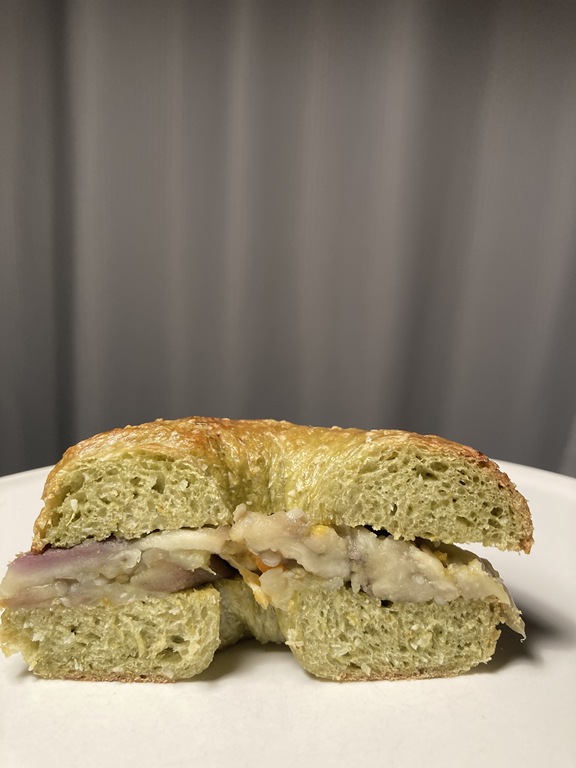 グリルしたなすは、硬い皮から柔らかい実をこそげとり、ホットクック製の半熟ゆで卵の黄身1/2を小さくちぎって、なすに混ぜ、お塩ひとつまみふってはさみます。すごーくおいしかったグリーンカレーベーグル。