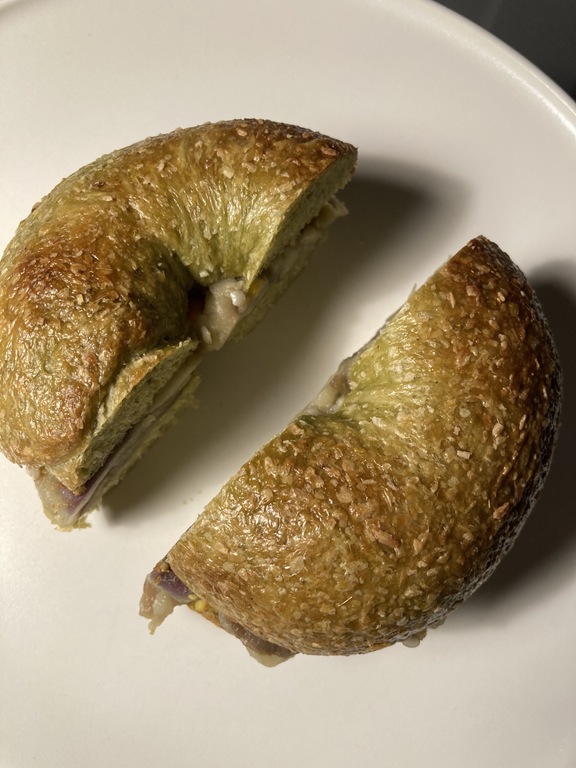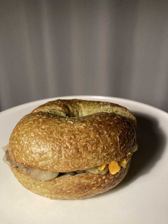 グリーンカレーのベーグルに、グリルしたなす+半熟ゆで卵の黄身(1/2個)をはさんだもの