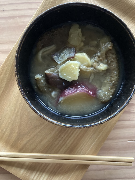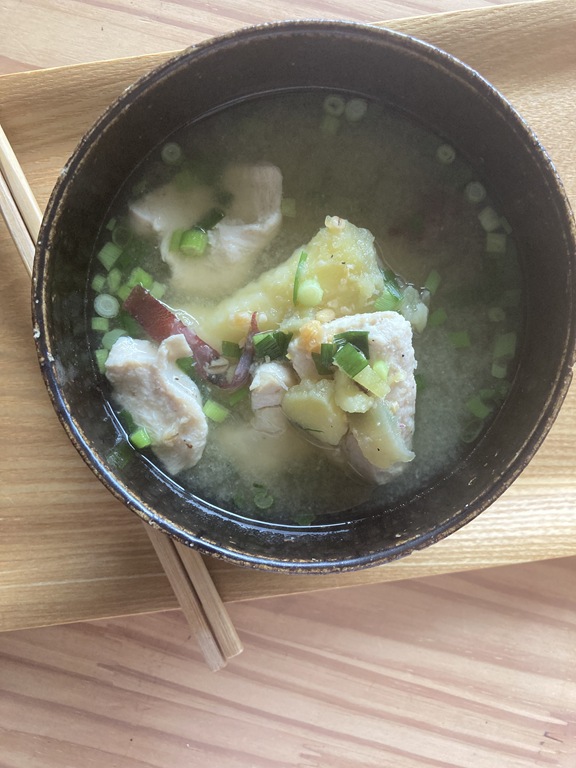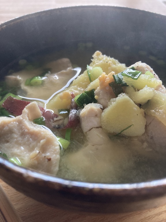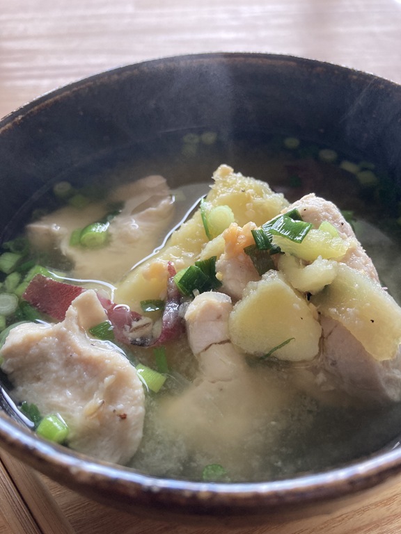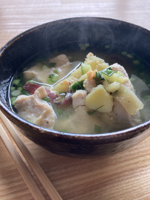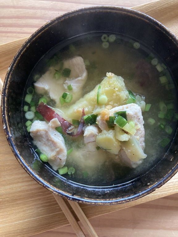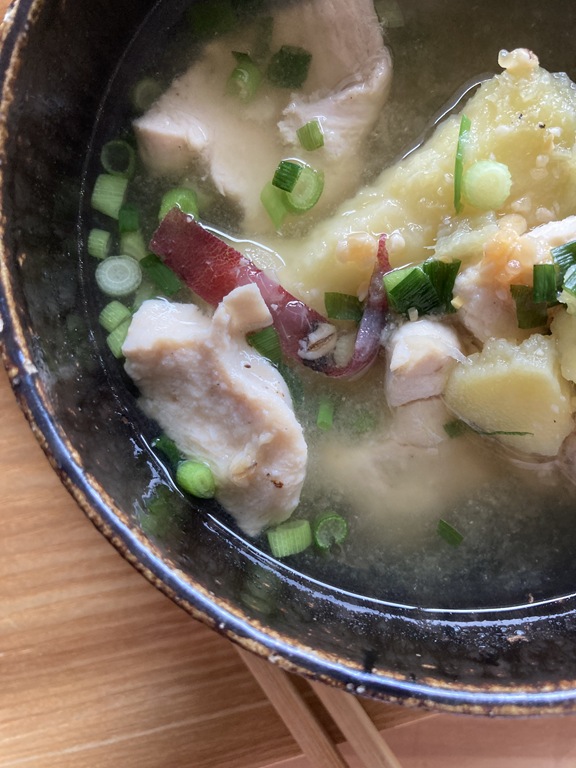 みそ汁 ホットクックで蒸したさつまいも、青ねぎ、ホットクックで煮込んだとりむね肉、かつおだし、麦米あわせ味噌