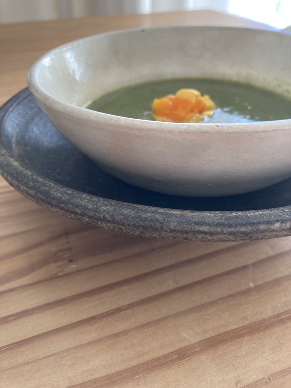 クリーミーな緑のスープ 小松菜、蕪の実、蕪の皮、じゃがいも、玉ねぎ少々。浮き実?に半熟ゆで卵の黄身1/2個分